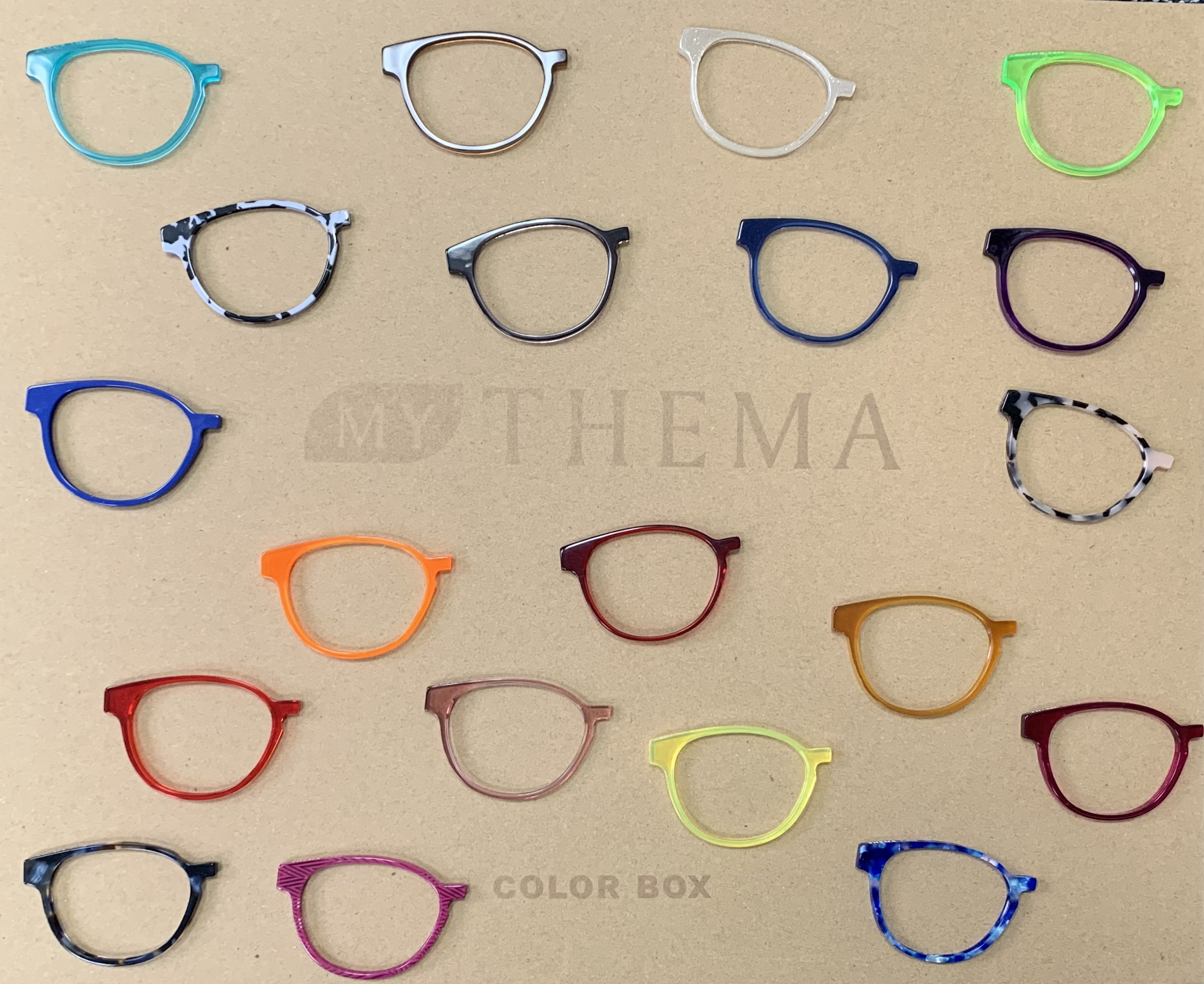 Kreiere deine eigene Brille mit nahezu endlosen Kombinationsmöglichkeiten dank unterschiedlicher Größe, Oberfläche, Bügeldesign und Farbe.